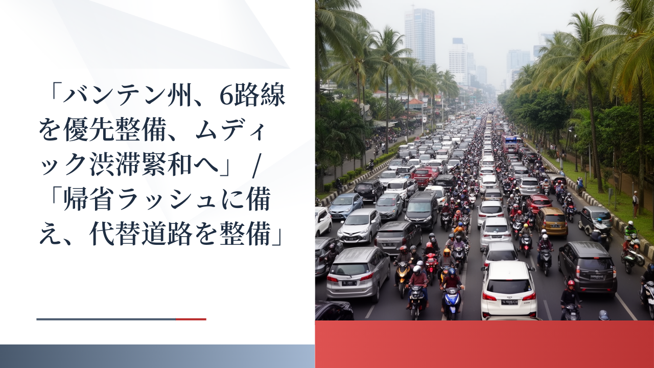 バンテン州政府は、2026年のレバラン帰省ラッシュ(ムディック)に向けて、州内6路線の道路整備を優先的に進めると発表しました。ジャカルタからスマトラ島方面へ抜ける要所であるバンテン州において、安全な代替ルートの確保が急務となっています。